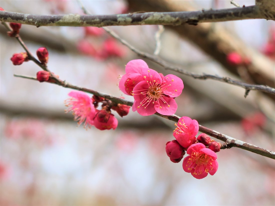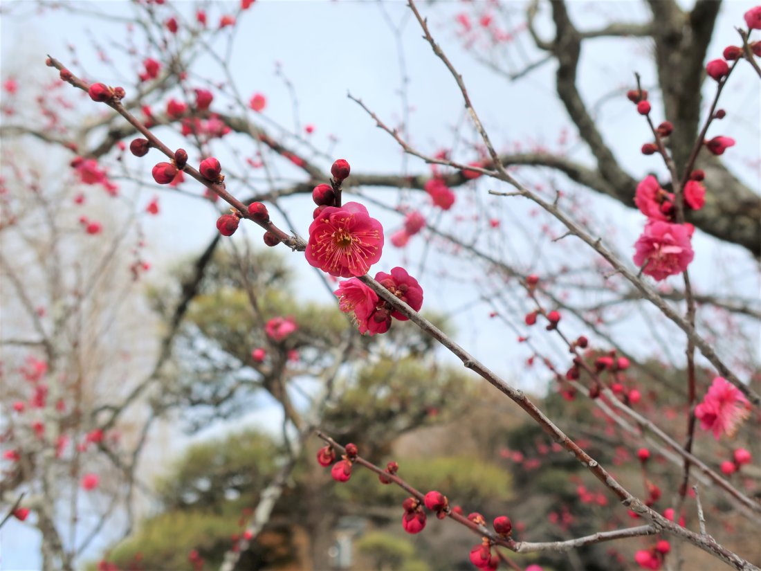 本園下の池周辺に紅梅が咲いています。