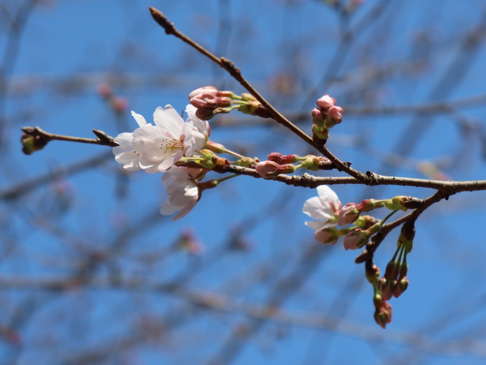 偕楽園の拡張部にある桜山の桜が咲き始めました。たくさんのつぼみもふくらんできています。桜山へお越しの際は、桜山第一駐車場をご利用ください。撮影日:3月24日(火)