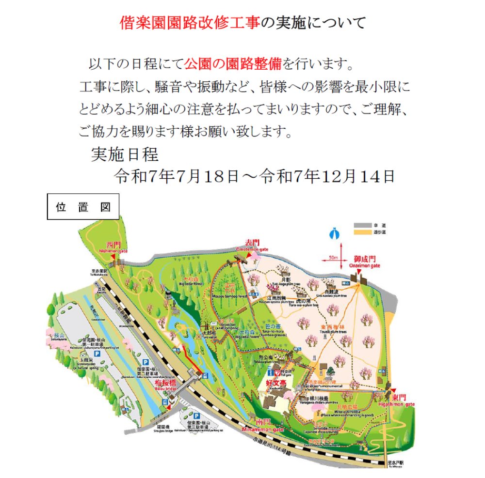 新着情報 2025.08.27 偕楽園下 園路改修工事のお知らせ【令和7年7月18日~12月14日】 偕楽園下の園路工事を下記期間実施いたします。 工事期間中は安全に十分留意して作業を行いますが、足元等に注意して通行いただくようお願いいたします。 公園の利用に際しご迷惑をおかけいたしますが、ご理解とご協力をお願いいたします。 【期間】 令和7年7月18日(金)~12月14日(日) ※工期は変更となる場合がございます。