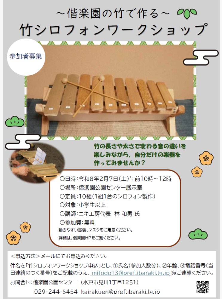 件名を「竹シロフォンワークショップ申込」とし、①氏名(参加人数分)、②年齢、③電話番号(当日連絡のつく番号)をご記載のうえ、 mitodo13@pref.ibaraki.lg.jp 宛ご連絡ください。