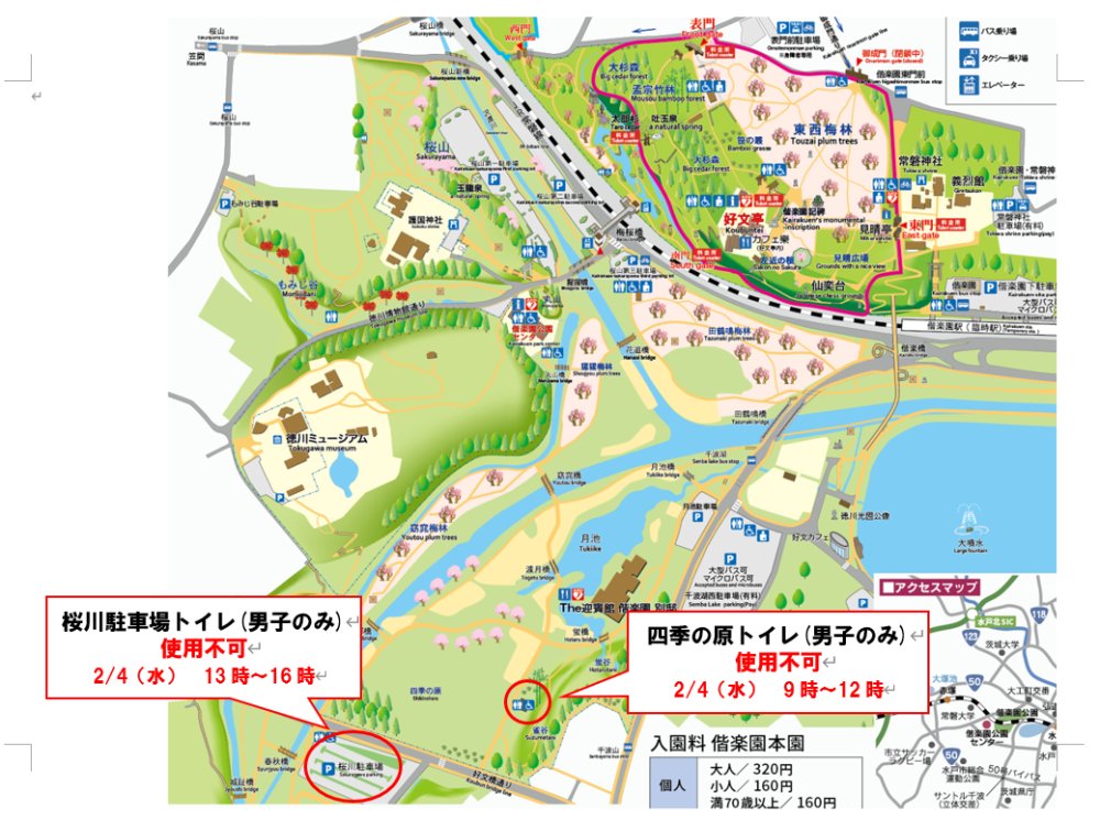 ご不便をおかけしますが、2月4日午前9時~12時までは桜川駐車場トイレを、午後13時~16時までは四季の原トイレをご利用ください。
