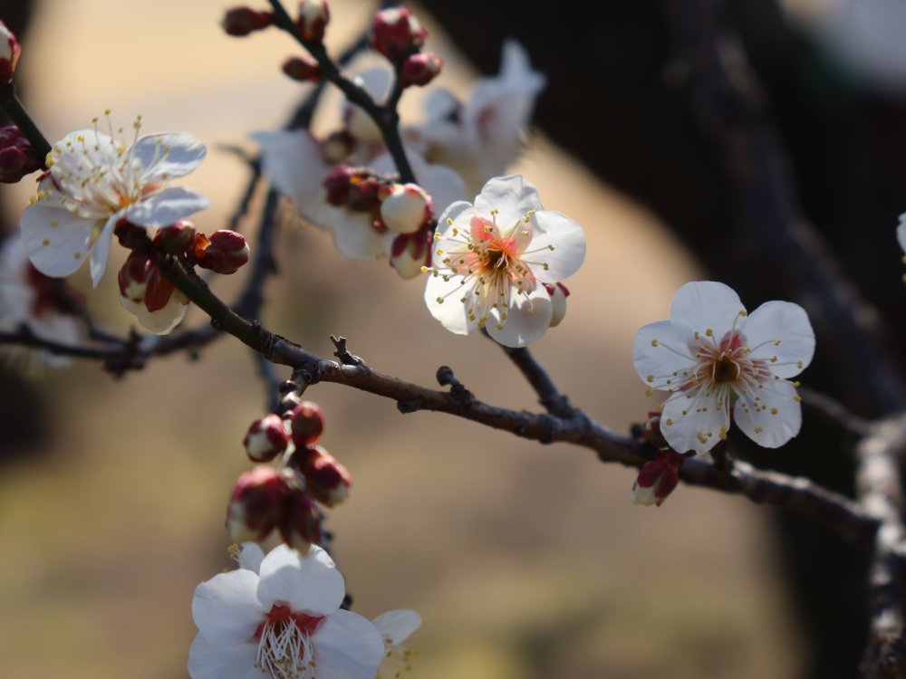 少しずつ咲いています。早咲きの梅(八重寒紅、満月、水心鏡など)がみられます。撮影日:1月26日(月)