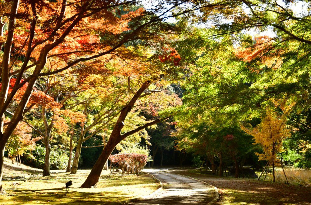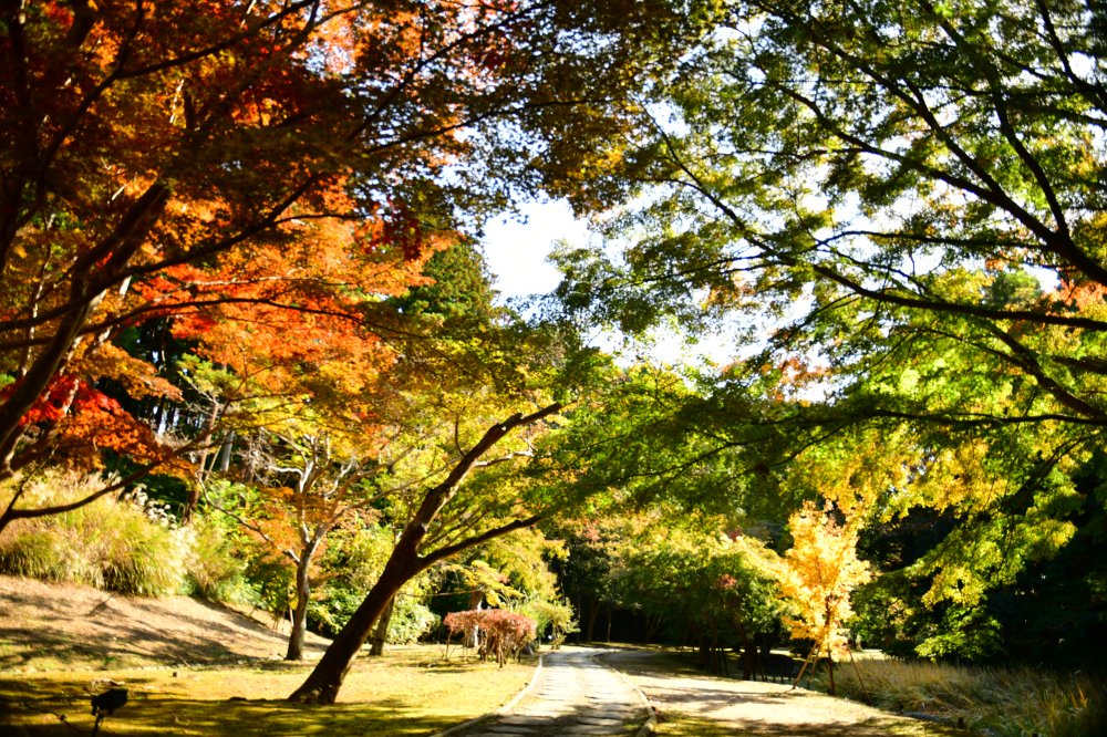 染まり方にばらつきはありますが、緑、黄色、赤と色とりどりの葉が光に透けてとても綺麗です。11月8日(土)~もみじ谷ライトアップも開催されます。ぜひ、ゆっくりと散策をお楽しみください。撮影日:11月7日(金)
