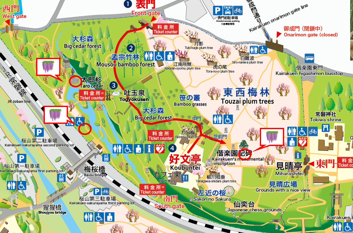 園内には3ヶ所の藤棚がありますので、散策の際は添付ファイルを参考にご覧ください。撮影日:4月20日